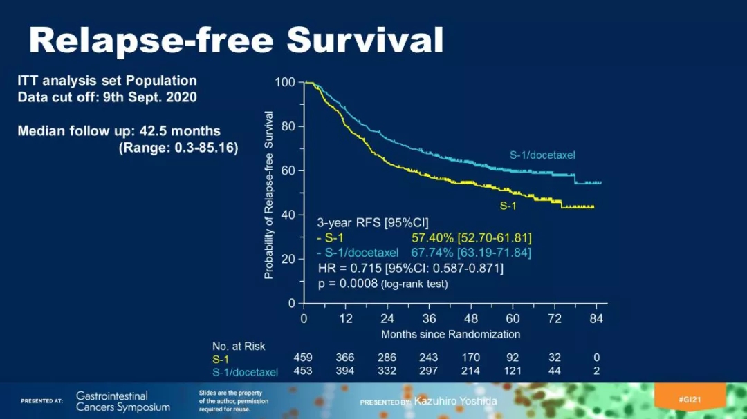 Kazuhiro Yoshida总结道,S-1+多西他赛被建议作为未接受新辅助化疗的病理Ⅲ期胃癌患者D2胃切除术后的辅助治疗。