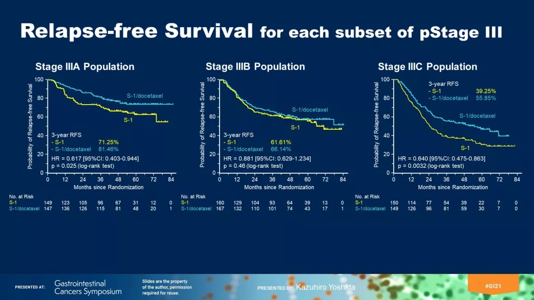 有趣的是,在亚组分析中,与ⅢA或ⅢC期患者相比,在S-1中加入多西他赛后,ⅢB期患者3年的RFS和OS没有明显优势(图4)。在讨论环节,H. Lee莫菲特癌症中心的Rutika Mehta博士指出,研究中,采用美国癌症联合委员会(AJCC)TNM分期第7版作为亚组分类的标准,可能是不准确的,可能导致研究结果模糊不清。为了支持其观点,Mehta博士引用了一项纳入了亚洲5000例胃癌患者的回顾性分析,该分析证明,根据AJCC TNM分期第7版分类为ⅢB期的胃癌患者,当采用AJCC TNM分期第8版时,会有33%被分类为ⅢC期。