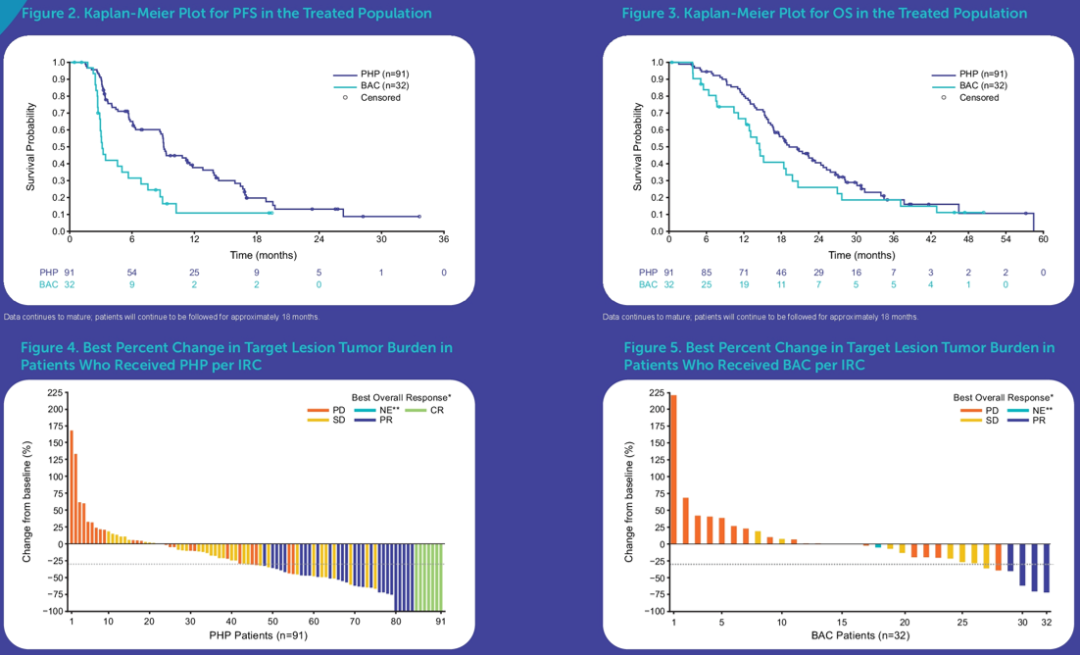 研究共纳入144例患者,其中PHP组102例(301:n=43;301A:n=59)和BAC组42例。91例PHP组(301例:n=40;301A例:n=51)和32例BAC组患者接受治疗。PHP、BAC组ORR分别为35.2%、12.5%。PHP组中位DOR为14个月,BAC组DOR不可计算。PHP、BAC组患者的DCR分别为73.6%、37.5%。PHP、BAC组中位PFS分别为9.03月、3.12月。PHP、BAC组中位OS分别为20.53月、14.06个月。在接受PHP治疗后进行安全性评估的94例患者中,42.6%的患者经历了严重的治疗相关不良事件,其中大多数为血液毒性,病程短暂,无后遗症。无治疗相关死亡事件发生。研究结果提示,与BAC相比,PHP在ORR、DOR、DCR、PFS和OS表现出了优势。