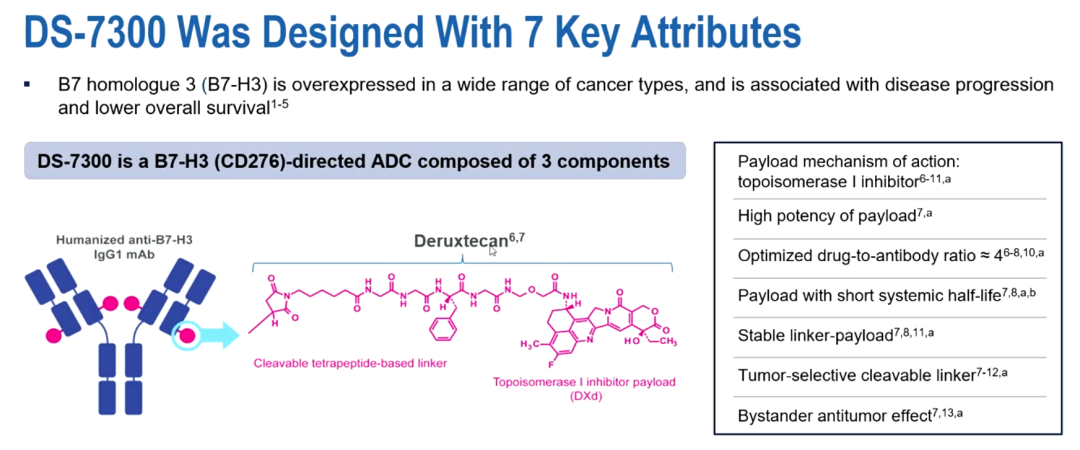 B7-H3是一种跨膜蛋白,属于B7家族(该家族也包括PD-L1),在肿瘤生长和免疫应答中有作用。B7-H3过表达广泛存在于多种癌症,与预后不良相关,是有潜力的治疗靶点。DS-7300是由第一三共研发的靶向于B7-H3的抗体药物偶联药物(ADC),由B7-H3单克隆抗体、可裂解的四肽连接子、拓扑异构酶I抑制剂exatecan(依沙替康)衍生物(DXd)构成。