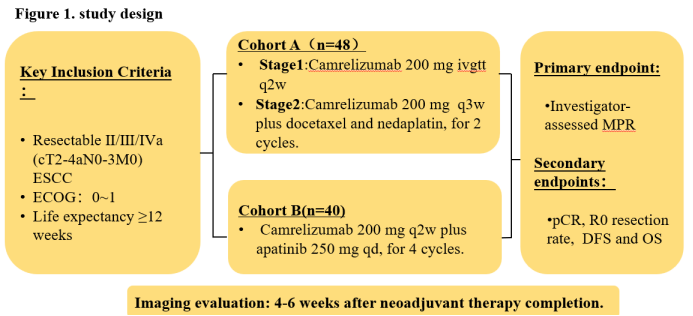 由郑州大学第一附属医院肿瘤科王峰教授和胸外科齐宇教授牵头开展的“卡瑞利珠单抗联合术前化疗或阿帕替尼治疗局部晚期食管鳞癌单臂、开放的Ⅱ期临床试验”包含两个队列,队列A为艾瑞卡联合多西他赛和奈达铂新辅助治疗后进行手术切除,队列B为艾瑞卡联合阿帕替尼新辅助治疗后进行手术切除。该研究为局晚期食管癌患者带来了新的希望。