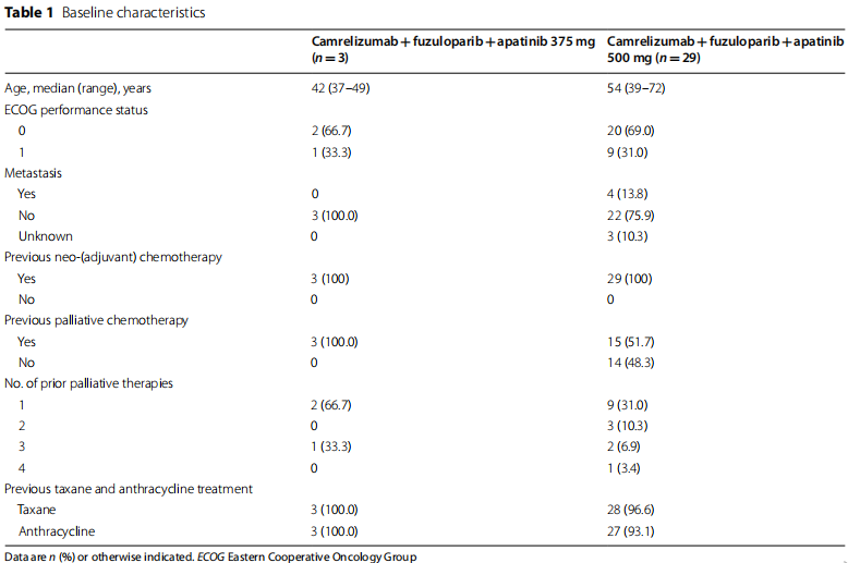 此项Ⅰb期研究包括剂量探索部分和剂量扩展部分。在剂量探索部分,引入了3+3剂量递增方案。患者接受卡瑞利珠单抗(200 mg,每2周一次)加阿帕替尼(375 mg或500 mg,每日一次)和氟唑帕利(起始剂量100 mg,每日两次)每28天为1周期。在评价给药方案的耐受性和安全性后,确定剂量扩展部分的临床推荐剂量。主要终点为剂量限制性毒性(DLT)。研究允许在(新)辅助治疗背景下接受过以紫杉烷或蒽环类药物为基础的化疗,并拒绝接受化疗治疗复发性或转移性疾病的患者入组。在复发或转移阶段,既往化疗线数不允许超过2线。同时,在入组剂量探索和剂量扩展的部分患者中采集血样用于阿帕替尼和氟唑帕利的药代动力学分析。