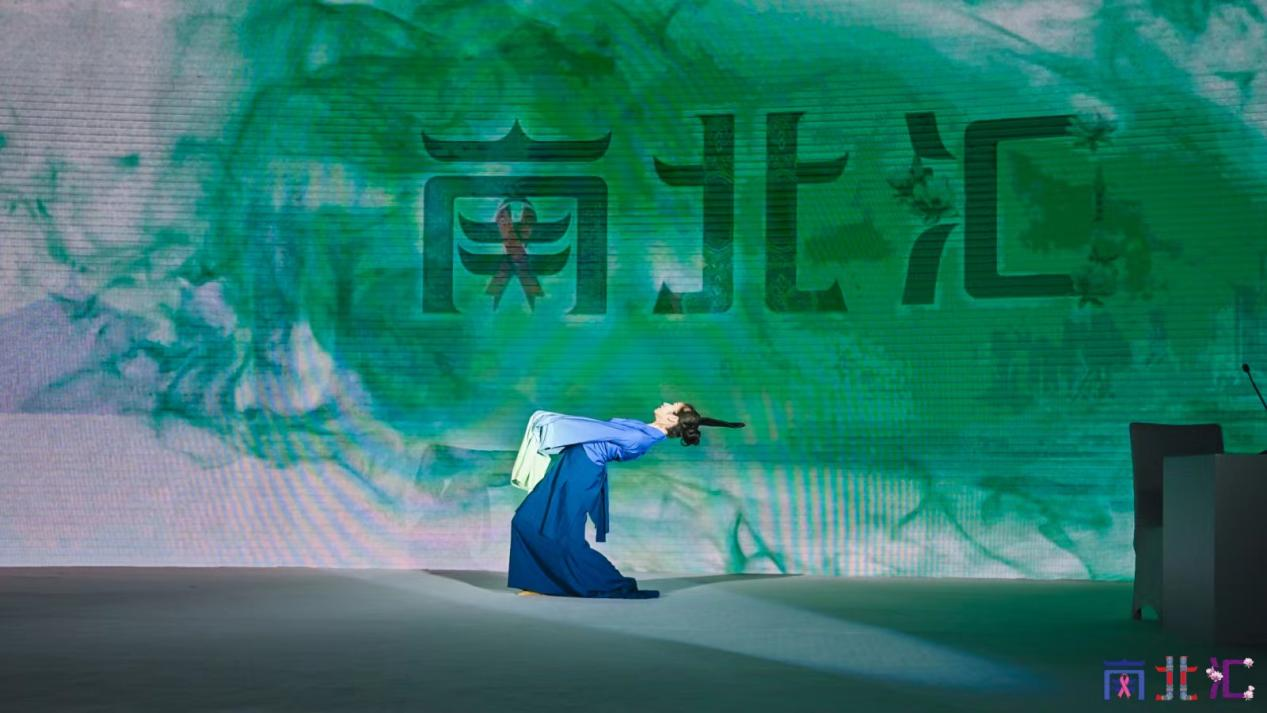 会议伊始,一名舞者来到舞台中央,随着大屏幕上《千里江山图》的画卷缓缓展开,舞者与烟波浩渺的江河、层峦起伏的群山构成了一幅美妙的江南山水图。随后,舞者在《千里江山图》背景的掩映下翩跹而舞,舞姿摇曳,《只此青绿》舞曲结束之时,舞者融在一片青绿色的山峦之中,成为千年前王希孟笔下的青绿山水。