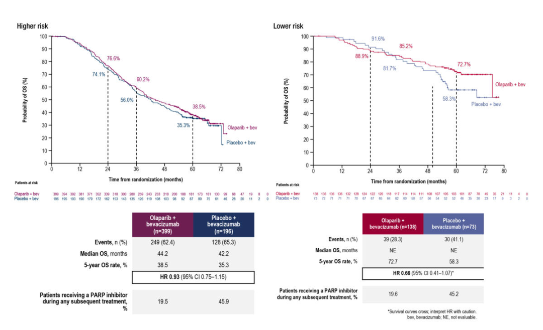 PAOLA1/ENGOT-ov25试验发布了一项事后分析,研究人员在接受贝伐珠单抗(15 mg/kg q3w,持续15个月)联合奥拉帕利(300 mg bid,持续24个月)或联合安慰剂维持治疗的患者中,基于临床风险和同源重组缺陷(HRD)状态评估了5年OS(摘要号32O)。研究人员将患者的临床风险分类为高风险(接受过手术且并有残留病灶或接受了新辅助化疗的III期患者;或IV期患者)和低风险(既往接受手术且无残留病灶的III期患者)。